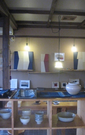 作品配置や基本レイアウトといった展示構想をいつもは事前に考えておくものだが、今回はあえて何も考えないようにして臨んだ。会場は女性陶芸家(広川さん)がひとりで運営している小さなお店で、その雰囲気を生かすためにも広川さんとの呼吸というか、作業中の何気ない会話のやりとりなどからも「場」を創ろうと考えたことが理由。店に常設されている