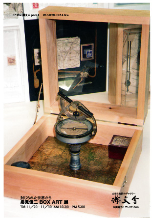 上越市在住の美術家。県立近代美術館、新潟市美術館等で作品収蔵されるなどシルクスクリーンの版画作品で知られる作家だが、ここでの展観は作家が近年展開しているBOX・ART。約30センチ角の方形の箱に自身の記憶などを封じこめてアート化した約30作品を展示する。