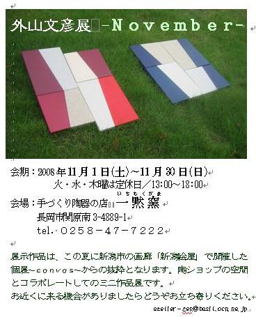 〈3〉での展示作品は、夏に新潟市の画廊「新潟絵屋」で開催した外山文彦展~canvas~からの抜粋です。陶ショップ空間の壁を使ってのコラボレーション&ミニ作品展となります。