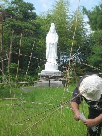 今回展では屋外(中庭)と室内(ギャラリー)でのインスタレーションの2本立てとなるが、この日はまずは屋外設置の「菊の支柱竹と熊鈴、結束バンドによる」作品から。昨年の弥彦野外アート展とギャラリーイーズでの個展で連続展開させた素材である。
